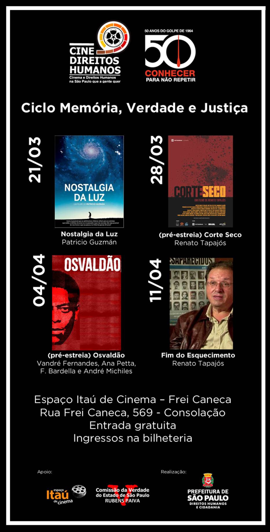 Confira a programação do Cine Direitos Humanos Iniciativa da SMDHC, o Cine Direitos Humanos leva sessões gratuitas de filmes com temática de direitos humanos ao Espaço Itaú de Cinema do Shopping Frei Caneca, na região central, todos os sábados, às 11h. Basta retirar o ingresso na bilheteria. A curadoria é de Francisco Cesar Filho. Cine Direitos Humanos: Ciclo Memória, Verdade e Justiça 21/3 “Nostalgia da Luz”, de Patricio Guzmán Patricio Guzmán viaja ao norte do Chile, para as áridas terras do deserto de Atacama, unindo dois pontos tão distantes no espaço e próximo em trabalhar com a memória: a astronomia e a busca pelos corpos de represálias por parte de Pinochet na ditadura. Com seus telescópios gigantes, o astrônomo olha o passado, a luz emitida por algumas estrelas que não podem mesmo existir, além de mães e esposas de desaparecidos a riscar o chão, buscando também a memória do país e de suas famílias.11/4 “O Fim do Esquecimento”, de Renato Tapajós O filme procura personagens que participaram do Tribunal de Tiradentes e outros que se destacaram na luta pelos Direitos Humanos, para retomar a questão da Doutrina de Segurança Nacional, depois de três décadas. Investiga os resquícios daquela doutrina nos dias de hoje, aborda a tentativa das classes dominantes de, depois que os militares saíram do poder, promover o esquecimento dos graves fatos ocorridos durante a ditadura e constata que, finalmente, o esquecimento está sendo combatido por diversas instituições e pessoas, sobretudo pelos jovens.