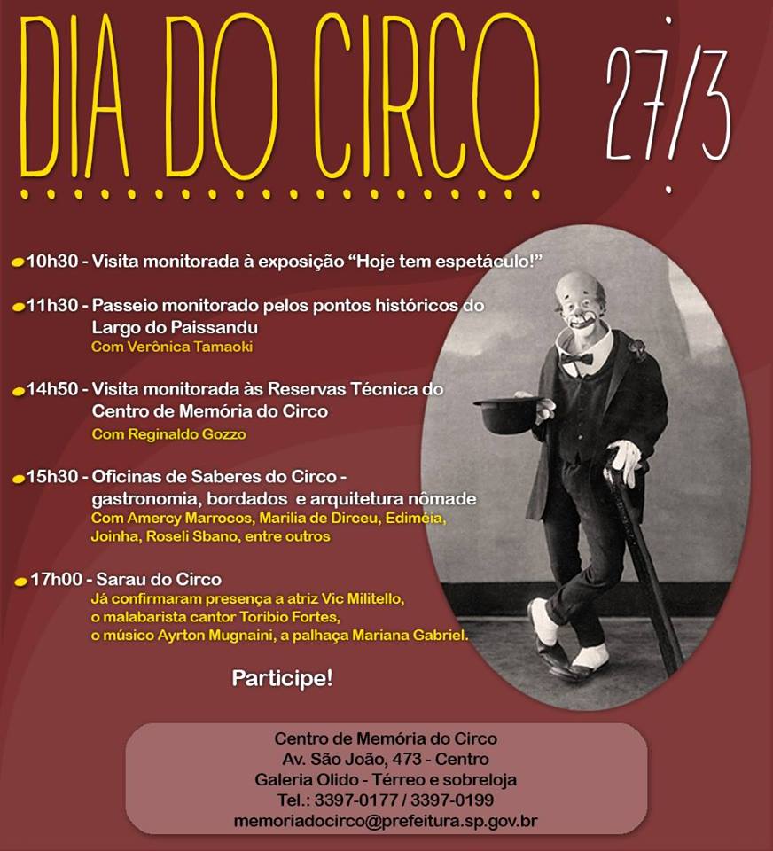 Hoje tem marmelada, tem sim sinhô! E o palhaço, o que é? É o personagem principal do Dia do Circo, que se comemora todo 27 de março em homenagem a data de nascimento do palhaço Piolin [Abelardo Pinto Piolin – 1897/1973], uma das mais completas expressões do circo brasileiro. Daí que o Centro de Memória do Circo manda avisar que esse 27 de março tem várias atividades em sua lona montada na Galeria Olido. Confira a programação e apareça