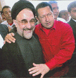 Interessante aqui discutir o conceito de terrorismo do ponto de vista de Chomsky (2002?:6-7), já que o conceito veiculado pela mídia é o mesmo empregado pelos Estados Unidos da América. Nos manuais militares norte-americanos, define-se como terror a utilização calculada para fins políticos ou religiosos, da violência, da ameaça de violência, da intimidação, da coerção ou do medo. O problema de tal definição é o fato de se explicar muito exatamente ao que os Estados Unidos chamaram de guerra de baixa intensidade, reivindicando esse gênero de prática. Na mesma edição de Veja, a entrevista das “páginas amarelas” é com a secretaria de Estado dos EUA, Condoleezza Rice, quando da ocasião de sua visita ao Brasil. A Condoleezza ganhou espaço nobre, é bajulada, recebe o título de “miss simpatia”. As duas primeiras perguntas da entrevista feita por Vilma Gryzinski. Veja – O presidente Hugo Chávez disse que há americanos preparando uma invasão da Venezuela. Verdade ou mentira? Rice – Isso é simplesmente um escândalo. É claro que os Estados Unidos não vão invadir a Venezuela ou fazer qualquer coisa do gênero. Os EUA querem ter boas relações com a Venezuela. Existem preocupações relativas à democracia na Venezuela e à maneira como e ela se relaciona com os vizinhos. Mas nós não vamos invadir a Venezuela. Veja – Qual é a melhor atitude a tomar quando se lida com um personagem como Chávez, que está sentado sobre um mar de petróleo, tem o apoio de 60% da população e pode usar as pressões americanas em seu favor? Rice – A única coisa que faz sentido é ter uma pauta positiva. É sobre isso que vim conversar aqui. Falamos sobre a Venezuela, é certo, mas foi uma parte relativamente pequena das discussões. Falamos também sobre o hemisfério, que fez progressos notáveis em termos de desenvolvimento democrático na última década…. Para a revista semanal vale a máxima, aos amigos tudo, aos inimigos a mentira e a manipulação. As fotos da edição As fotos da edição nº 1903 da Veja revelam o que o restante da mídia tenta fazer cotidianamente. A foto da capa mostra um Hugo Chávez carrancudo, boina vermelha, blusa vermelha. Um fundo vermelho ressalta o aspecto “cara de mau”. Nas páginas 156 e 157 a revista elenca uma série de 4 fotos de Chávez com “seus amigos” o líder do MST João Pedro Stedille; o ex-presidente iraquiano Saddam Hussein;o “ditador” Muamar Kadafi (figura 3) e o iraniano Khatami (figura4). Esqueceram de colocar as fotos de Chávez com Bill Clinton, ou com o papa João Paulo II, mas como a matéria é parcial, preferiram retratar o “maluco de Caracas” com outros “malucos” mundiais. As fotos são usadas para instrumentalizar, selecionar e fortalecer o sentido desfavorável ao presidente venezuelano. ![]() Figura 3: Hugo Chávez com o ditador Muamar Kadafi, em visita à Líbia, em 2004.