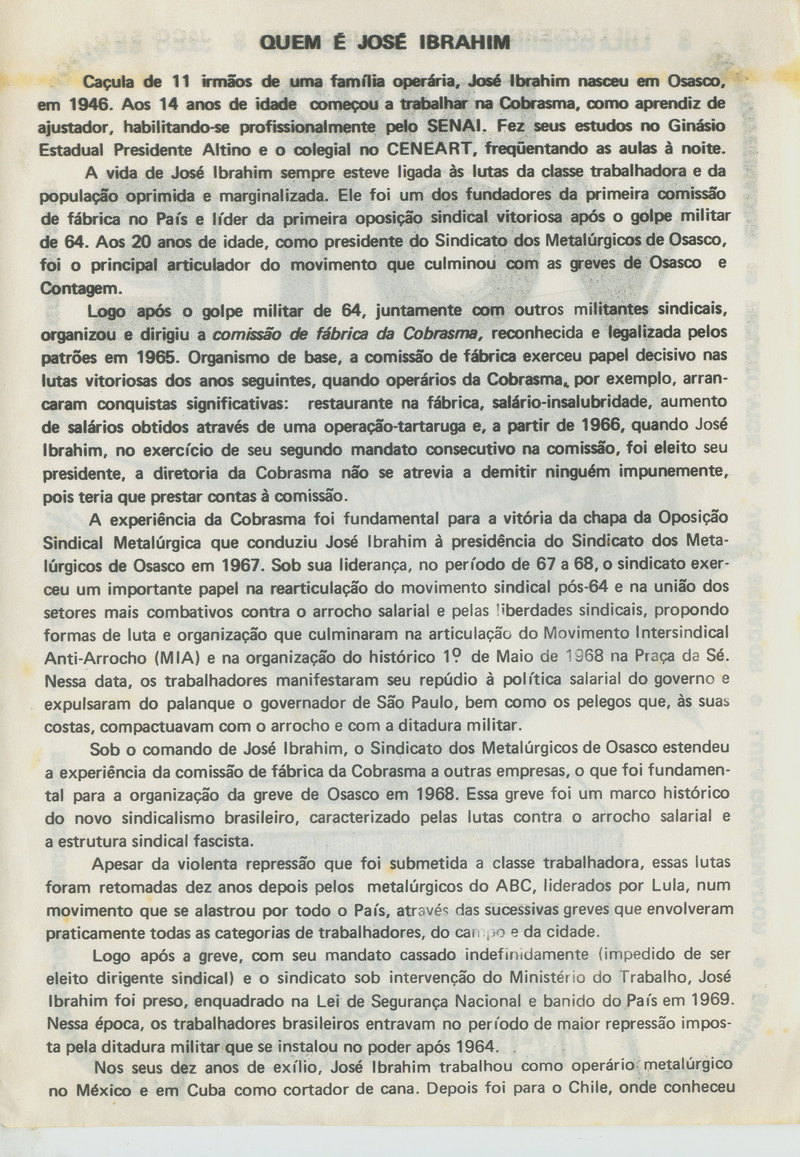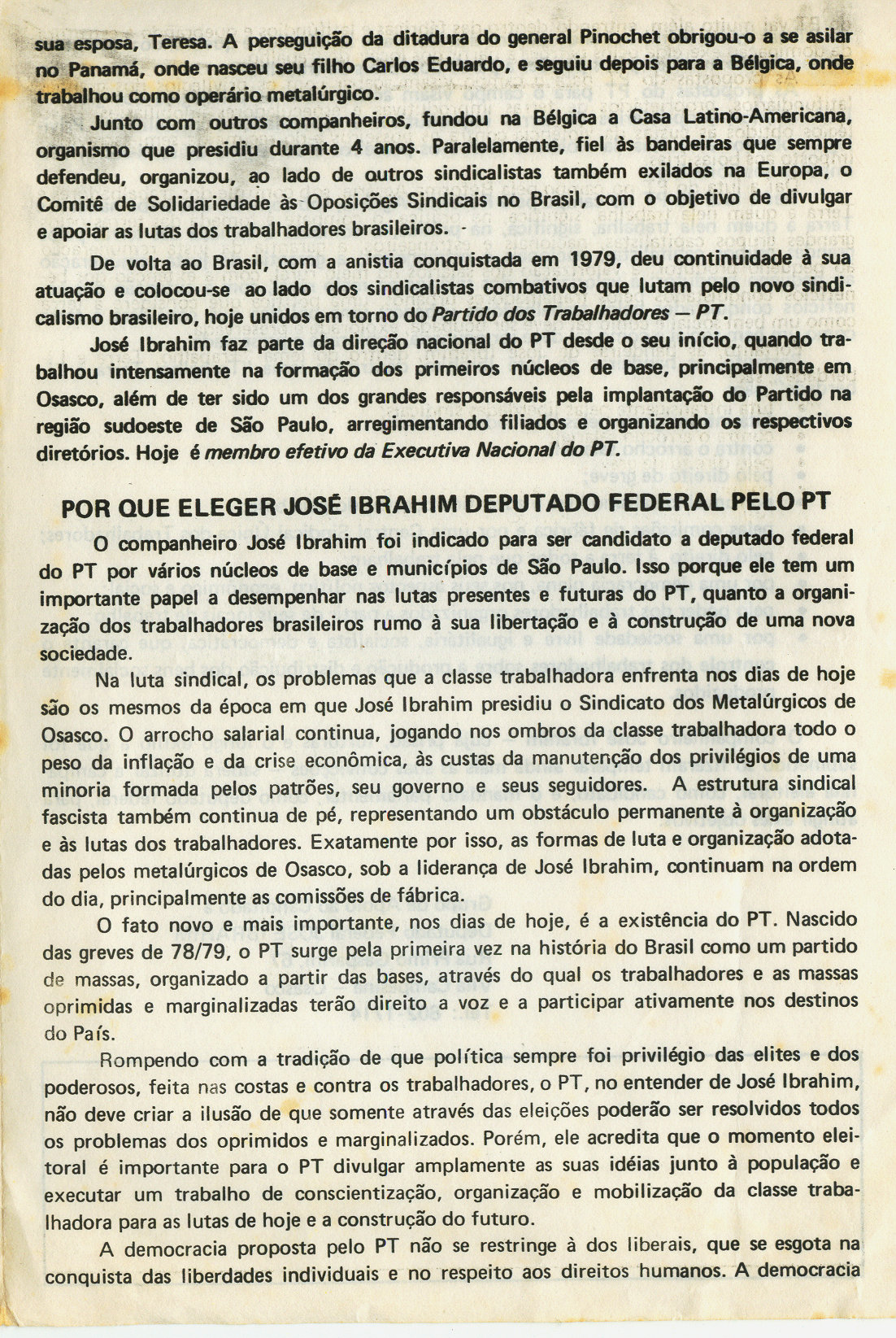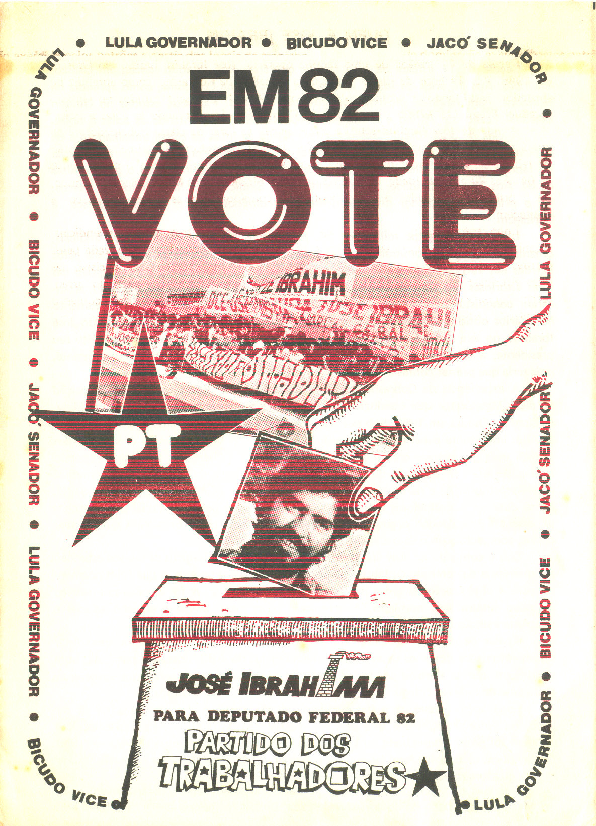 Em 1982 Ibrahim foi candidato a deputado federal num esforço para organizar o PT, reproduzimos abaixo cópia de seu material de campanha, que participamos ativamente.