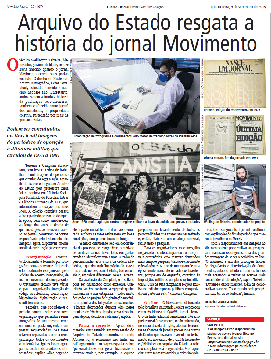 O jornal alternativo Movimento (1975), fundado pelo jornalista Raimundo Pereira, está disponível na forma digital no Arquivo do Estado.