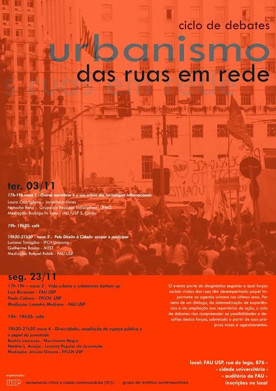 – Ciclo de Debates: O Urbanismo das Ruas em Rede: 23/11 (segunda-feira). Mesa 3: às 17h; Mesa 4: às 19h30 no auditório da FAU – USP (Rua do Lago, 876)