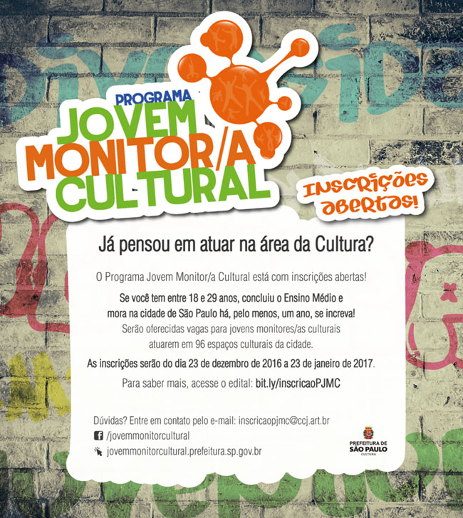 São Paulo, 23 de dezembro de 2016 – A Prefeitura de São Paulo, por meio da Secretaria Municipal de Cultura (SMC), divulga a abertura do edital para o cadastro reserva do Programa Jovem Monitor/a Cultural em 2017. As inscrições serão do dia 23 de dezembro de 2016 a 23 de janeiro de 2017 para jovens de 18 a 29 anos interessados/as em atuar nos espaços culturais e departamentos da SMC.