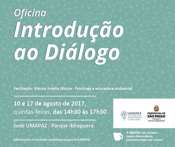 UMAPAZ comunica a abertura de inscrições para participação na Oficina de Introdução ao Diálogo. A oficina é pré-requisito aos interessados em participar do Grupo Experimental de Diálogo, que acontece às quintas-feiras, das 14h30 às 16h30, semanalmente, sob a coordenação e facilitação de Márcia Amélia Moura, docente da UMAPAZ.