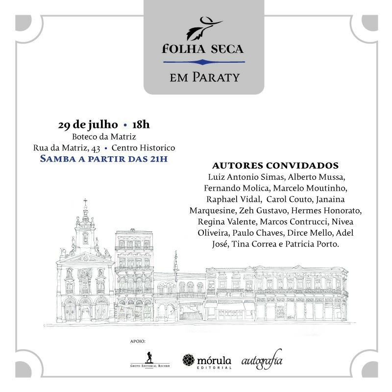 Paralelamente à programação da Flip 2017 – viva Lima Barreto! – no sábado acontece em Paraty um encontro de autores, às 18h, com roda de samba a partir das 21h. “Folha Seca em Paraty”, busca reproduzir o clima bacana da livraria mais charmosa do Rio e é capitaneado pelo produtor Raphael Vidal, com apoio da Editora Autografia, da própria Livraria Folha Seca e da Editora Mórula.