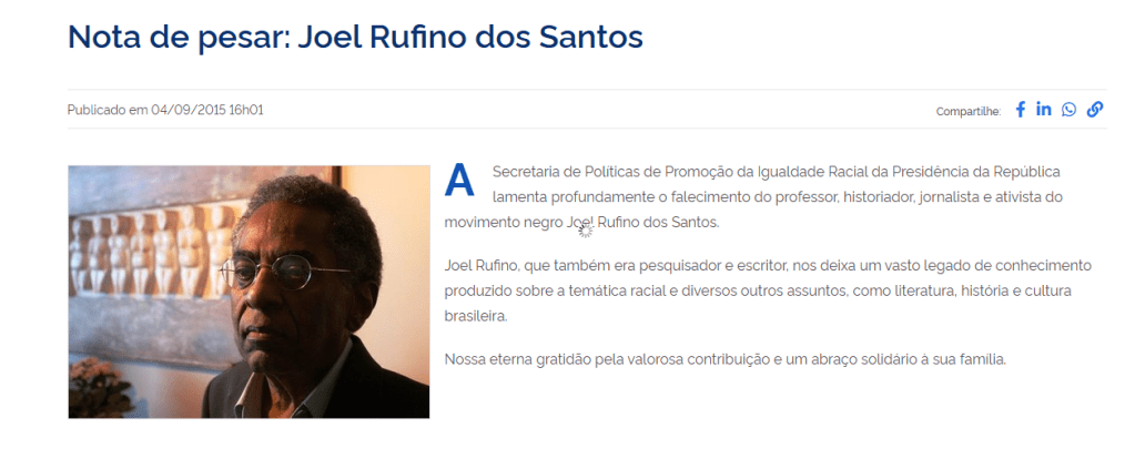 Com tristeza vejo esta nota de falecimento. #JoelRufinodossantos foi meu professor no Cursinho Universitário lá pelas bandas de 78/79. Dias destes meu filho estava lendo um livro indicado pela escola e comentei com ele: “esse cara foi meu professor. um cara muito bacana!”. Um grande batalhador pelas causas culturais e da população negra do Brasil. #rip Já raiou a liberdade…