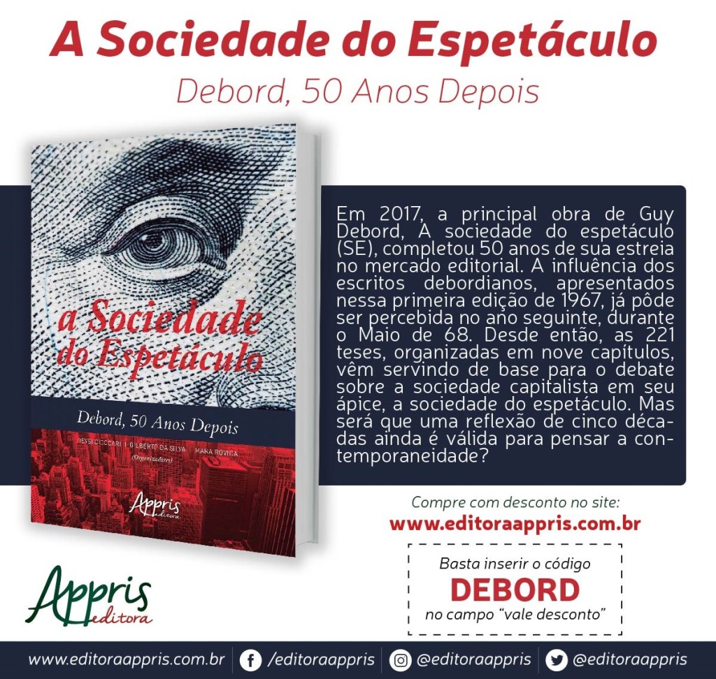 O livro A Sociedade do Espetáculo – Debord, 50 anos depois com desconto por um curto tempo. Corra. O livro já está cadastrado nas livrarias Martins Fontes, Cultura, Saraiva, Livrarias Curitiba, Livraria da Folha, Amazon, Submarino, Americanas e Shoptime.
