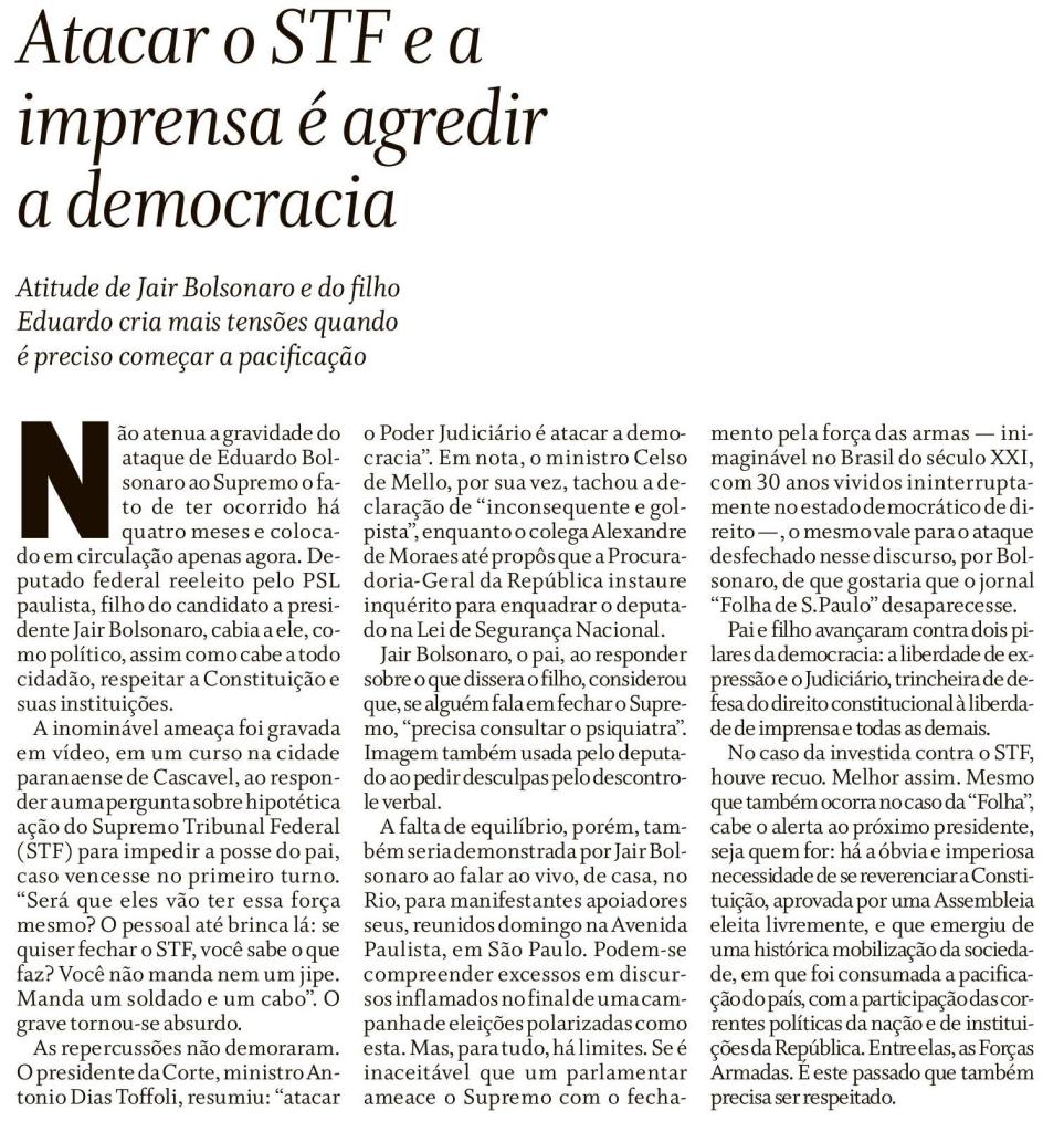 Editorial de o GLOBO, veiculada em 23/10/2018, alerta sobre os ataques à democracia