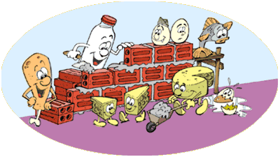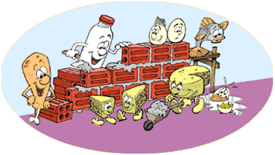 - Construtores: São as proteínas, que têm a função de construir e manter nossos tecidos e órgãos. Encontramos: nas carnes (boi, peixe, aves), ovos, leite e derivados (queijo, iogurtes, creme de leite), grãos (ervilha, feijão, lentilha, grão-de-bico). Também devem ser consumidos todos os dias em todas as refeições, mas evitando os alimentos gordurosos, dando preferência aos magros, desnatados, sem pele ou gordura aparente.