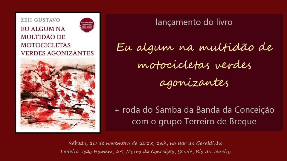 A luta, a resistência às sombras se faz por nossos corpos e também por nosso canto, nossa arte na rua. No dia 10 de novembro, sábado, o Terreiro de Breque estará de volta ao Morro da Conceição, no aconchego especial do Bar do Geraldinho, na zona portuária do Rio de Janeiro, para mais uma roda do Samba da Banda da Conceição. O repertório é sempre especial, ainda mais em tempos de resistência política e cultural. E dessa vez há um atrativo para lá de especial: trata-se do segundo lançamento da nova obra literária do fundador, cantor e compositor do Terreiro de Breque, Zeh Gustavo: “Eu algum na multidão de motocicletas verdes agonizantes” (Editora Viés). O livro tem apresentação de Alberto Mussa e texto de orelha de Godofredo de Oliveira Neto.