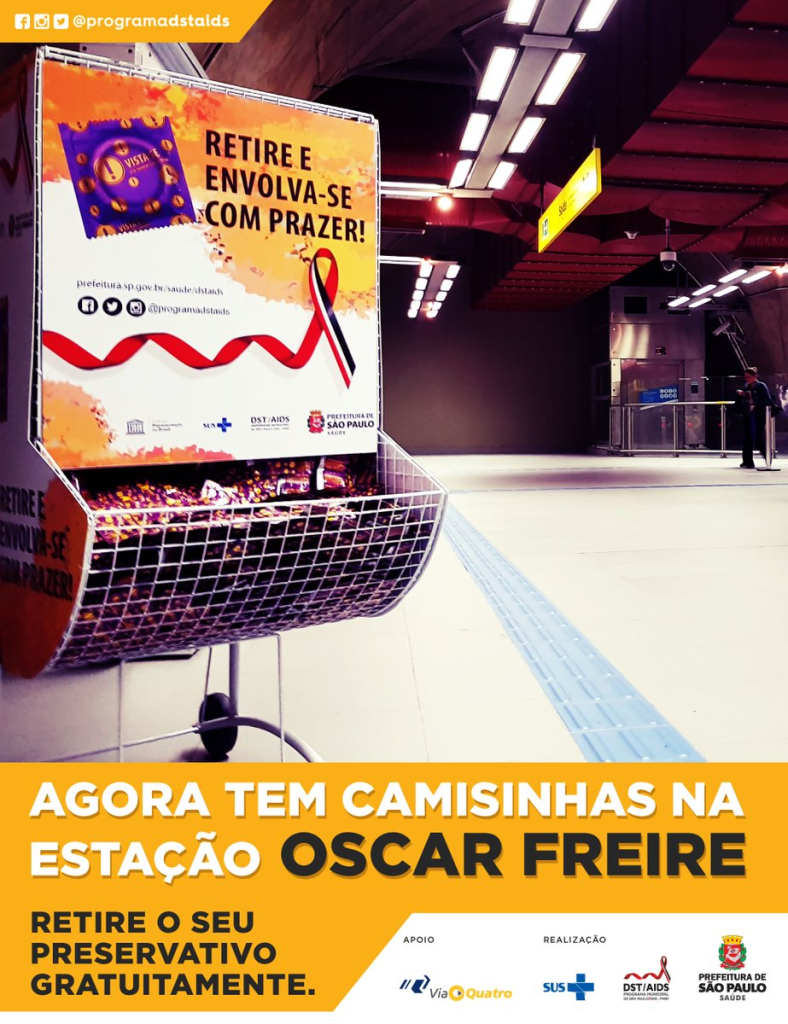 As CAMISINHAS NO METRÔ, do Programa Municipal de DST/Aids de São Paulo chegaram à estação Oscar Freire da linha 4-Amarela do metrô! Agora, já são 22 estações que contam com enormes dispensadores de preservativos para você! É pegar sem pagar, levar e usar conscientemente.