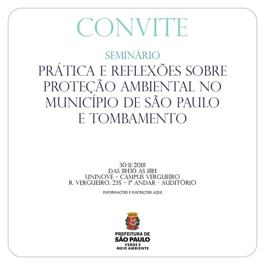 Com o tema “Prática e Reflexões: Proteção Ambiental no Município de São Paulo e Tombamento”, a Secretaria do Verde e do Meio Ambiente (SVMA) realiza, no dia 30 de novembro (sexta), um seminário destinado a discutir tanto a proteção ambiental, quanto o tombamento, temas de grande relevância na cidade de São Paulo. O evento será realizado no campus Vergueiro da Uninove, das 9h às 18h, reunindo especialistas nas matérias. A iniciativa é capitaneada pelos Departamentos de Planejamento Ambiental (DEPLAN) e de Parques e Áreas Verdes (DEPAVE) da SVMA.