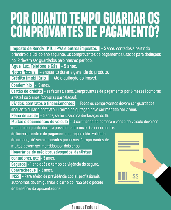 Apesar de não haver uma legislação específica sobre o prazo para guardar os comprovantes de pagamento, as entidades de defesa dos direitos do consumidor orientam que os seguintes comprovantes devem ser preservados por cinco anos: