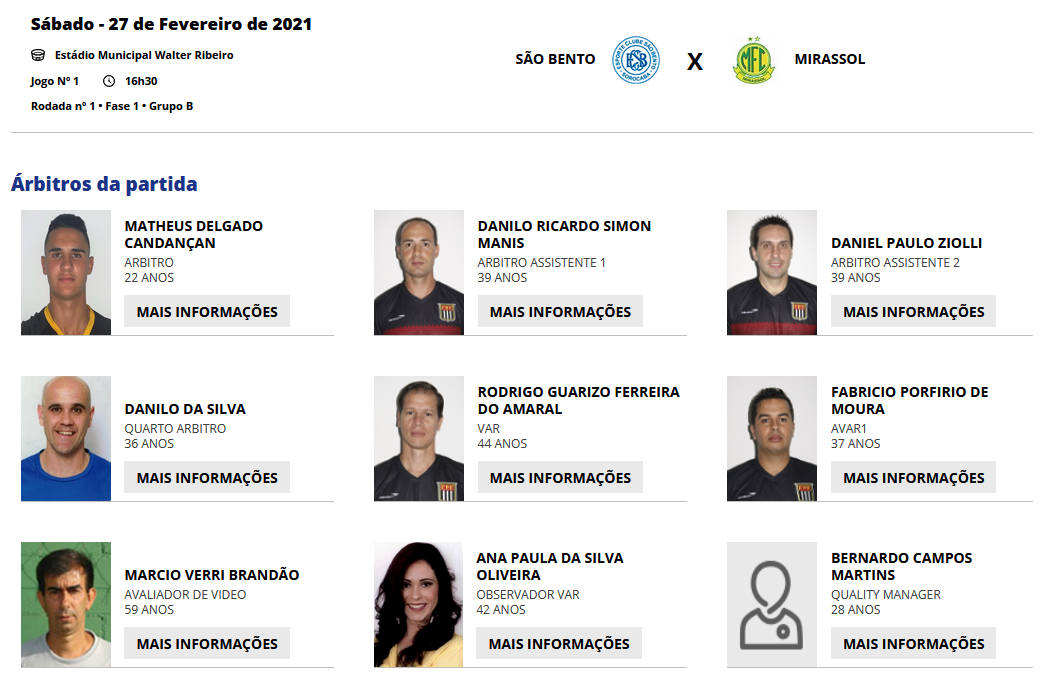 O VAR do jogo São Bento x Mirassol, na rodada inicial do Paulistão Sicredi 2021, apresentou problema técnico na comunicação entre o campo e a sala do VAR por uma falha no equipamento da Hawk-Eye, empresa de tecnologia contratada para a operação. Aos 2min de jogo, o VAR recuperou as imagens. No momento da revisão do lance no ARA, no início da partida, houve nova falha tecnológica da empresa no envio do sinal da imagem para o campo. No entanto, o lance foi revisado da sala do VAR, e as informações e descrições do lance transmitidas ao árbitro em campo. O problema foi resolvido no intervalo, e o VAR voltou a funcionar normalmente até a conclusão do jogo. A FPF solicitou à Hawk-Eye um relatório com esclarecimentos sobre os problemas técnicos ocorridos na partida.