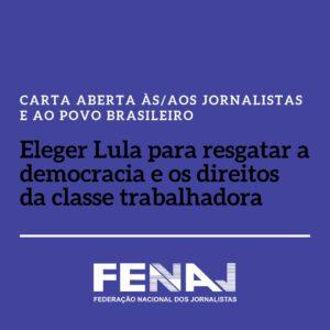 A Federação Nacional dos Jornalistas (FENAJ), entidade máxima de representação da categoria no país, dirige-se novamente às/aos jornalistas e à sociedade, conclamando cada uma e cada um a abraçar em definitivo a justiça social, a soberania nacional, os direitos da classe trabalhadora, as liberdades de expressão e de imprensa e a democracia.