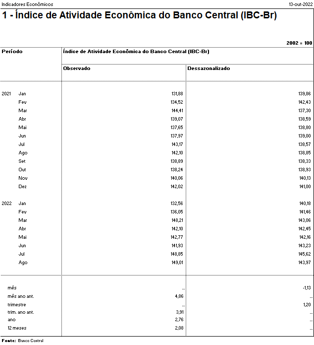 Em agosto, o IBC-Br atingiu 143,97 pontos. Na comparação com agosto de 2021, houve crescimento de 4,86% (sem ajuste para o período, já que a comparação é entre meses iguais). No acumulado em 12 meses, o indicador também ficou positivo, em 2,08%.