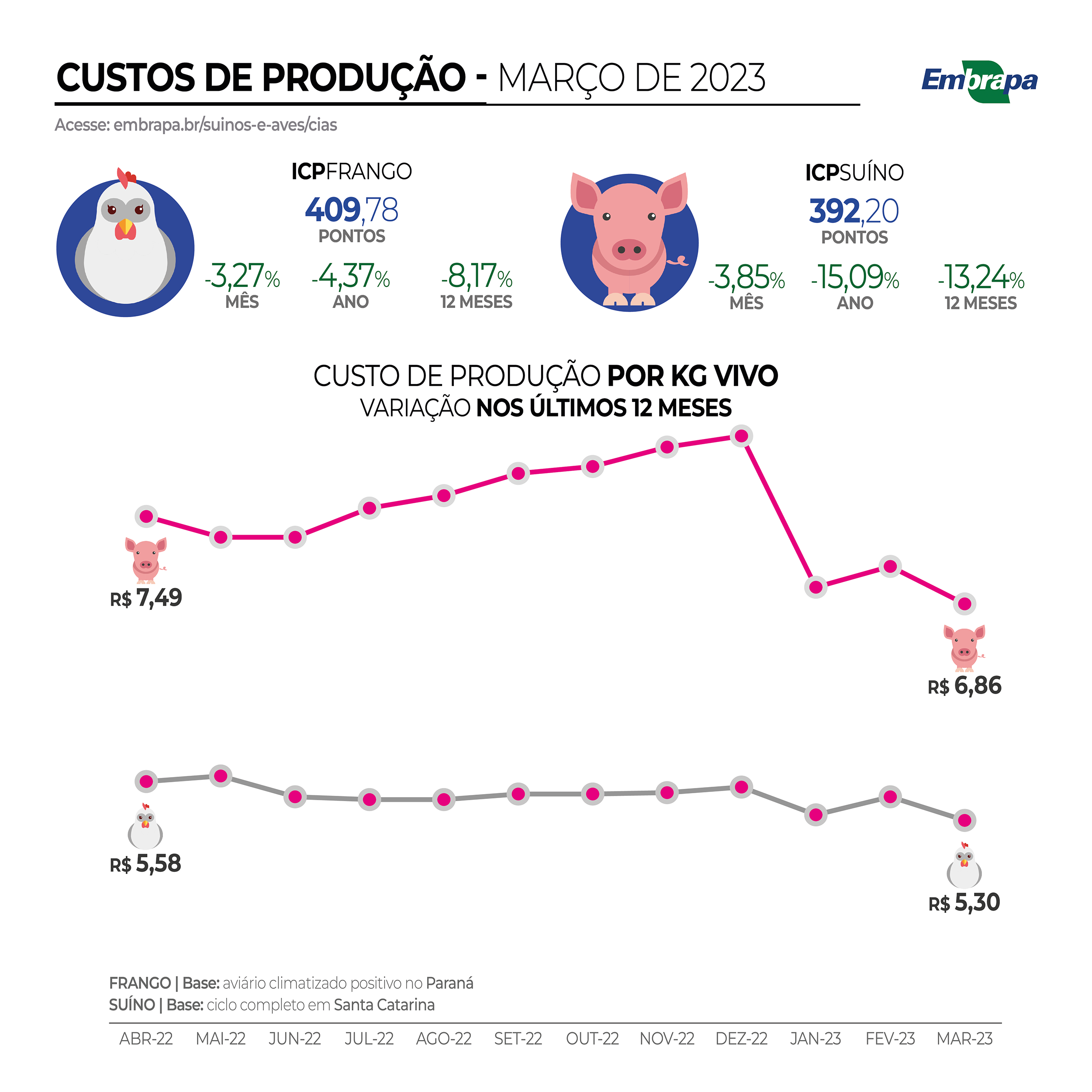 Os custos de produção de suínos e de frangos de corte diminuíram no mês de março segundo os estudos da Central de Inteligência de Aves e Suínos (CIAS) da Embrapa Suínos e Aves, disponível em embrapa.br/suinos-e-aves/cias). O ICPSuíno diminuiu 3,85% no mês de março em relação a fevereiro, fechando em 392,20 pontos. Já o ICPFrango caiu 3,27%, encerrando mesmo período em 409,78 pontos.