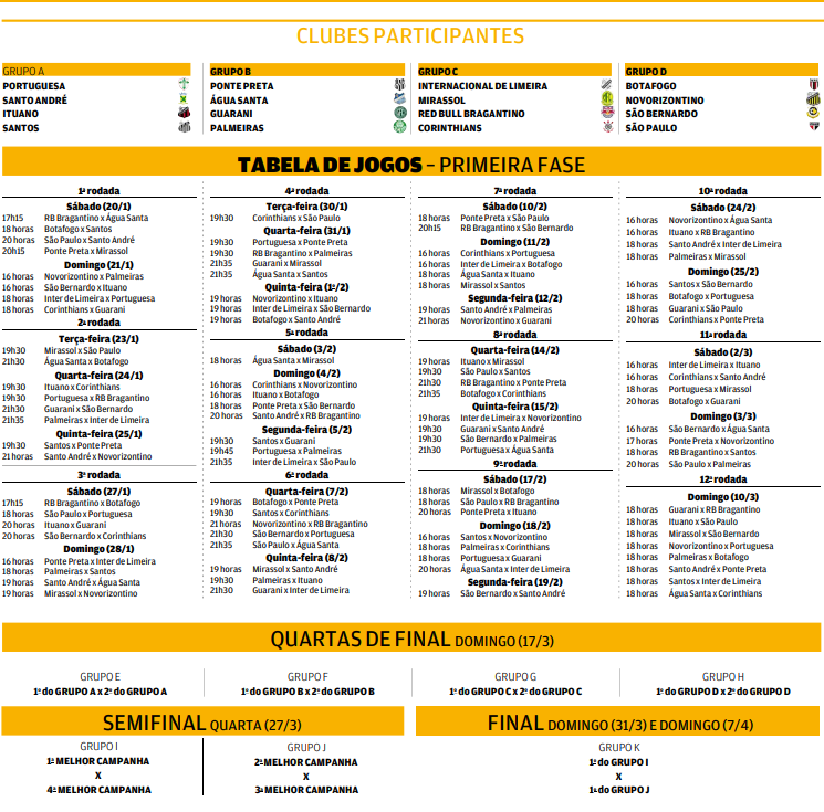 Atual bicampeão Palmeiras estreia no domingo (21), às 16h, diante do Novorizontino, em Novo Horizonte. Vice-campeão, o Água Santa também joga fora de casa, no sábado (20), às 17h15, contra o Red Bull Bragantino, em Bragança Paulista.