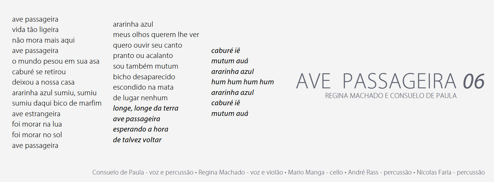 O acordeom e a percussão também brilham na sexta faixa, o xote “Ave Passageira”, uma canção afetuosa na qual o canto das compositoras alerta para as aves extintas ou ameaçadas de extinção. (…) Ave passageira / O mundo pesou em sua asa / Caburé se retirou / Deixou a nossa casa / Ararinha azul sumiu, sumiu / Sumiu daqui bico de marfim (…). A composição “Ave-preta”, segundo Regina que canta a canção, “é o lugar da magia”. Do repertório, é a que mais conduz para esse lugar, tanto em letra como em música. (…) Distante do teu ninho / Ave preta, ave preta / Passarinho elegante / Semente e navio / Paisagem de rio / Oito pontas, oito pontes / Oito saltos / Miragem, mistério / Habitante do tempo / Desse sonho de beira-rio. Ao som do violão da intérprete e do melodioso cello de Manga, as imagens sugeridas, amorosamente, se expandem. Em “Vento-mar”, oitava canção do álbum, Regina canta e toca o violão, cuja textura musical preciosa se completa com os fraseados do piano de Guilherme Ribeiro. A letra evoca uma ave de metal, espaços vazios e ausências – (…) A saudade tem cor de metal / Asa de avião / Asa de animal / Meu olhar procurando o teu / Numa brisa na beira do mar / Faço estrada riscando o papel / Passarinho com tinta e pincel / O teu nome partindo o ar / E eu sozinha na ponta do mar (…) – e fecha esse segundo momento de Pássaro Futuro, cujo corpo foi sonoramente delineado.
