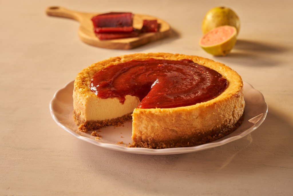TORTA CREMOSA DE REQUEIJÃO E RICOTA E COM CALDA DE GOIABADA
