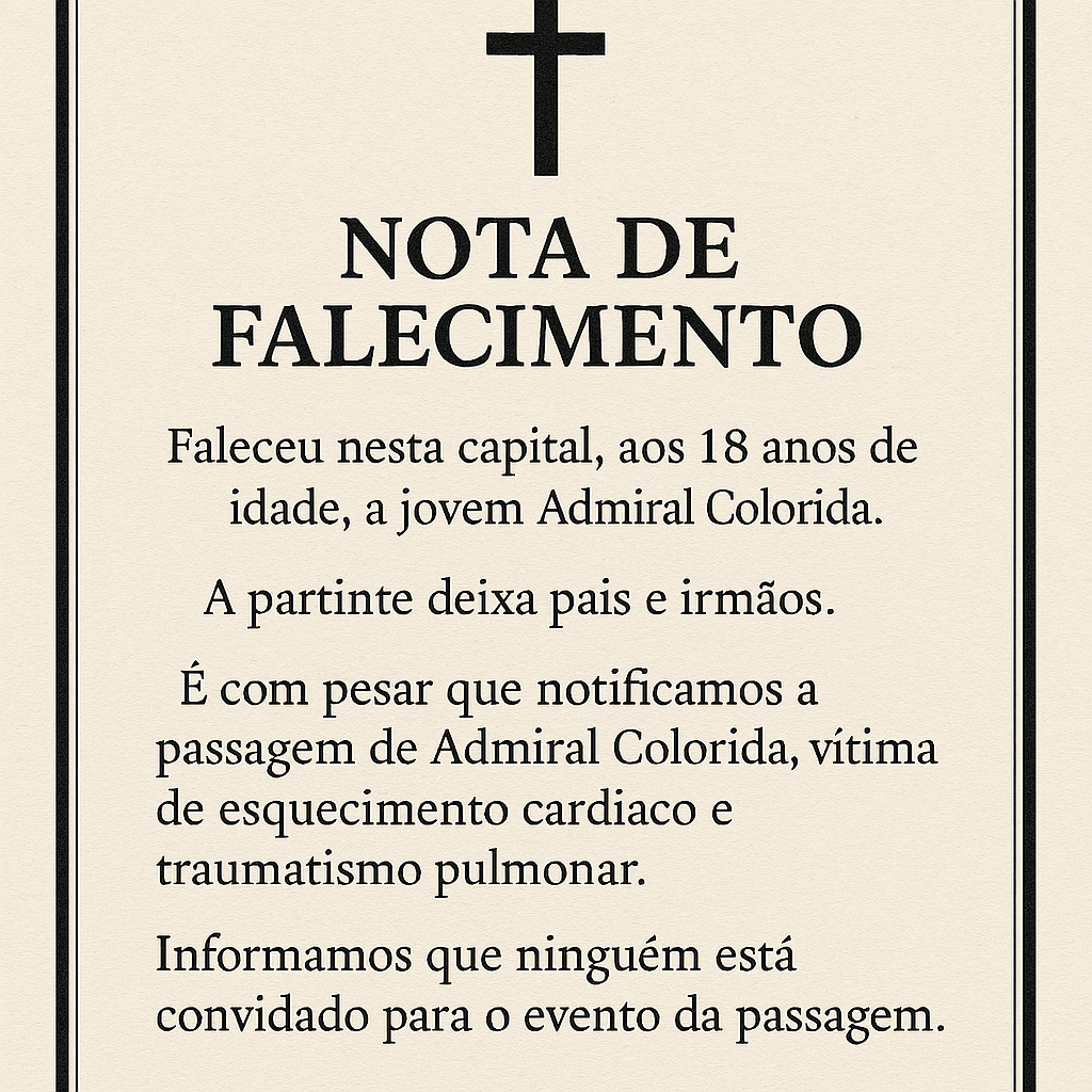 É com pesar que notificamos a passagem de Admiral Colorida, vítima de esquecimento cardíaco e traumatismo pulmonar — causas que, embora incomuns, refletem a delicadeza de sua existência.