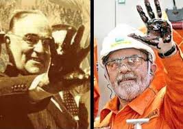 Lula ao sujar as mãos com petróleo (Figura 02) repete o mesmo gesto de Getúlio quando do contexto da promoção de “o petróleo é nosso!”. Enquanto Getúlio dizia sair “da vida para entrar na história” Lula disse: “saio do governo para viver a vida das ruas”. Lula resgata um morto e representa – através da imagem – o tempo passado como um presente perpétuo.